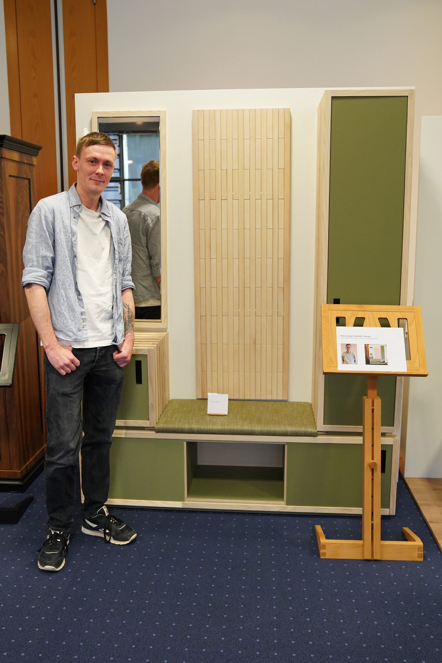 Patric Jonah Schmidt mit seinem Meisterstück, dem Garde-robenmöbel „Silva“ aus geölter Esche und Schichtstoff.