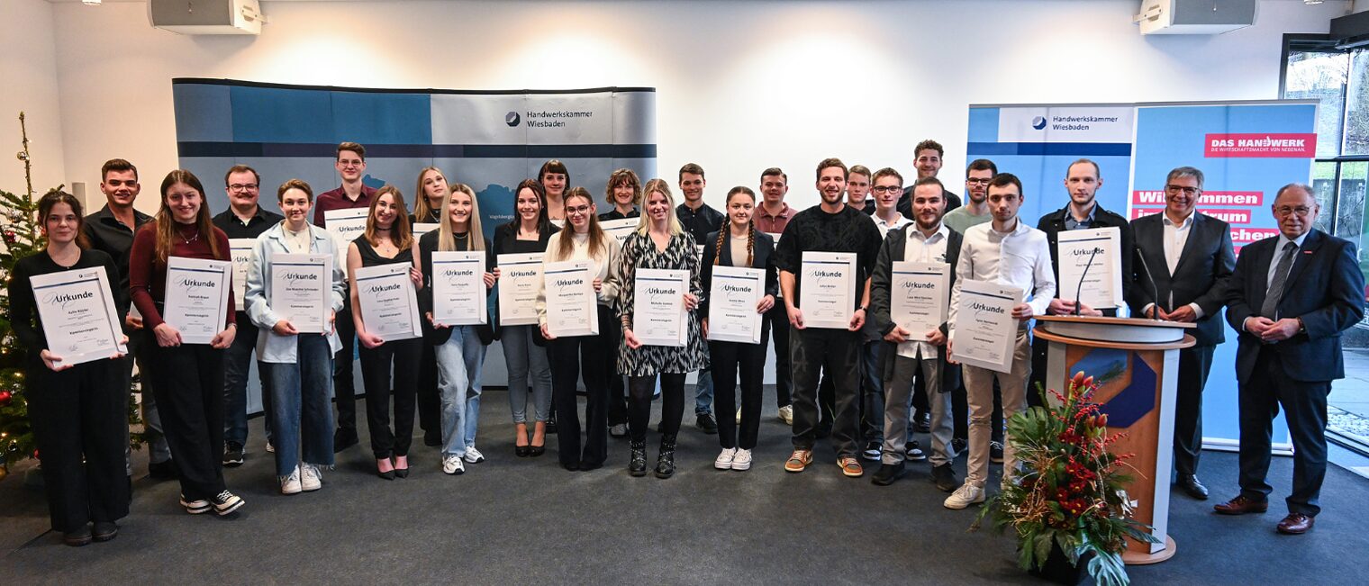 Die Handwerkskammer Wiesbaden hat 34 Gesellinnen und Gesellen aus dem Kammerbezirk ausgezeichnet, die im Rahmen der Deutschen Meisterschaft im Handwerk – German Craft Skills 2025 (DMH) auf Kammer-, Landes- oder Bundesebene erfolgreich waren. Kammervizepräsident Joachim Wagner ehrte zusammen mit Wiesbadens Oberbürgermeister Gert-Uwe Mende im Meistersaal die erfolgreichen Nachwuchshandwerkerinnen und -handwerker mit einer Urkunde, eine Geldprämie und einem Geschenk-Gutschein.
